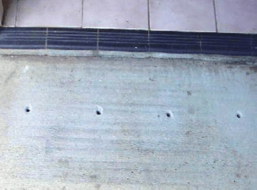 The holes may be 3/8 to 5/8 inch in diameter and about 12 inches apart +/-; then they are sealed with mortar, caulking or capped off with plastic plugs. These treatment holes are often observed on the exterior perimeter of homes, where there are concrete walks or patios or they may be observed on an interior slab, such as the garage floor.