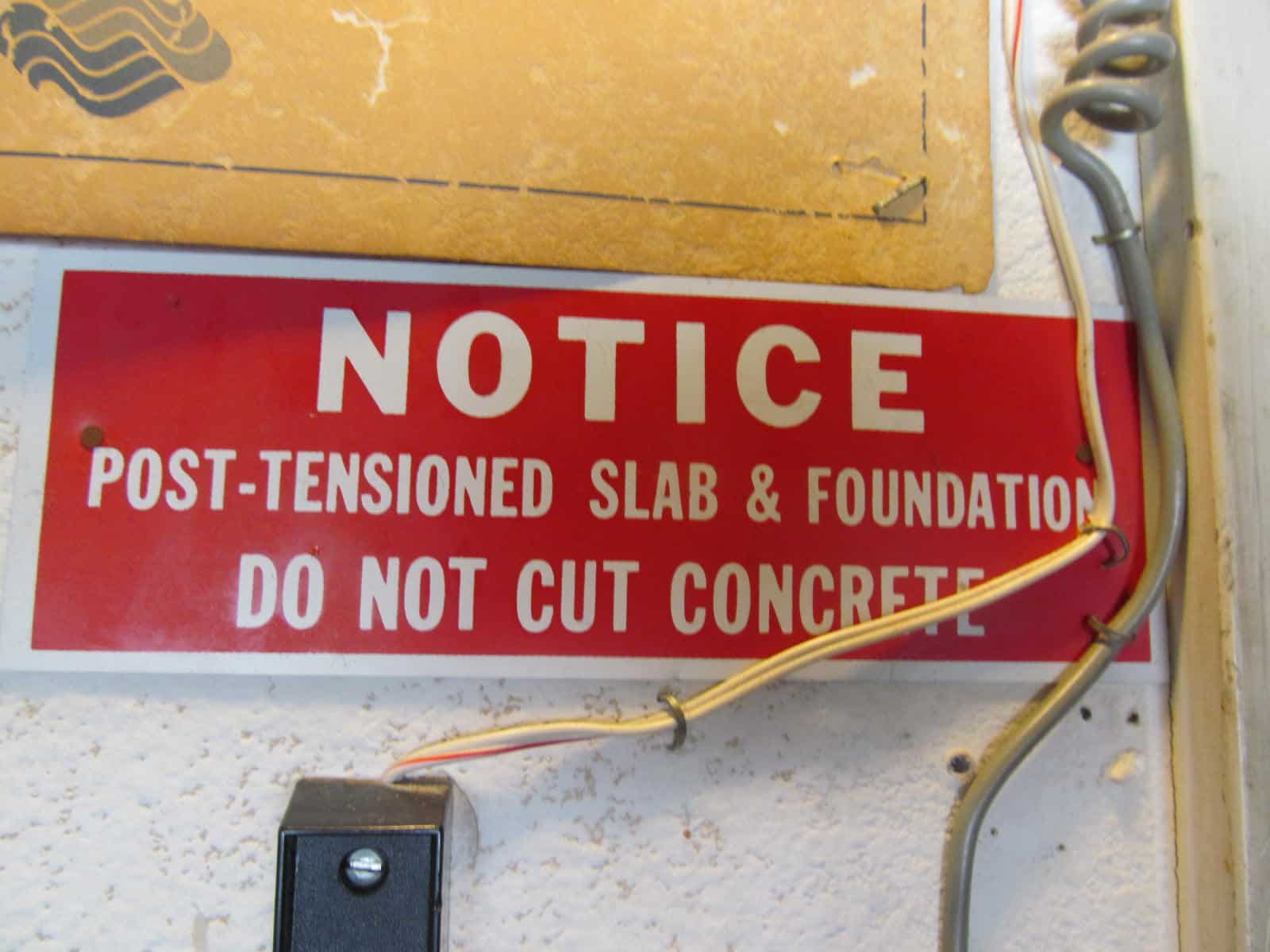 Post tension reinforced concrete slabs can often be identified by a sign stamped in the concrete garage floor or by a plastic warning sign placed on the garage wall. The reason for the warning sign is to alert the owner not to cut or drill into the concrete without having a professional contractor do the cutting or drilling – **it’s a safety thing, because if one cuts a post tension cable, it may whip upward and injure the person.
