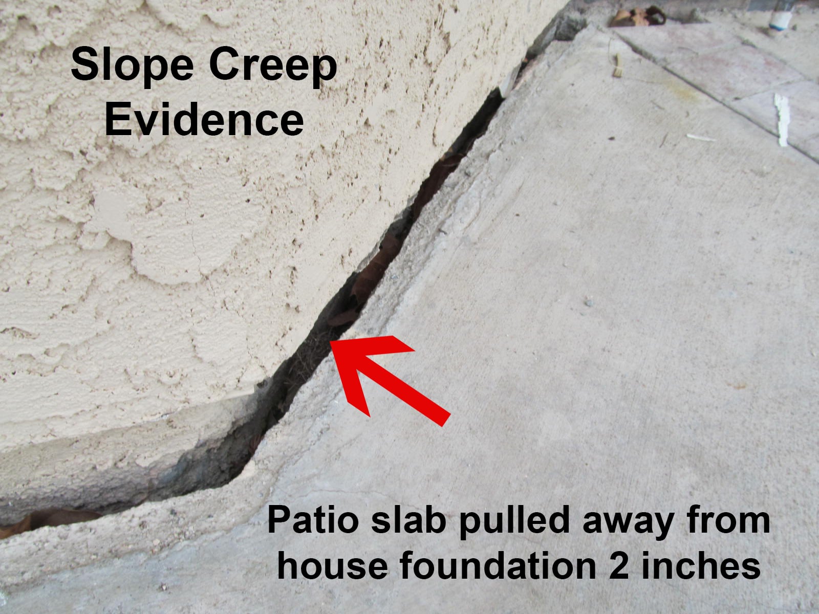 An example of slope creep is shown in the photo where the patio has moved away from its original position against the home’s foundation. This may occur over a number of years; however, it may occur rather rapidly if there have been earthquake tremors or a landslide type of condition.